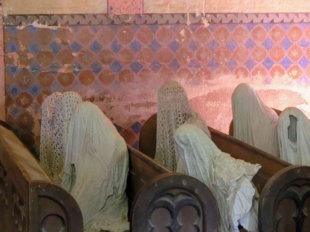 As part of an art campaign to revive abandoned churches in Bohemia and also to address the post-war history between the Czech Republic and Germany, artist Jakub Hadrava1 installed ghosts on the church pews. The roof was also repaired thanks to donations and funding.